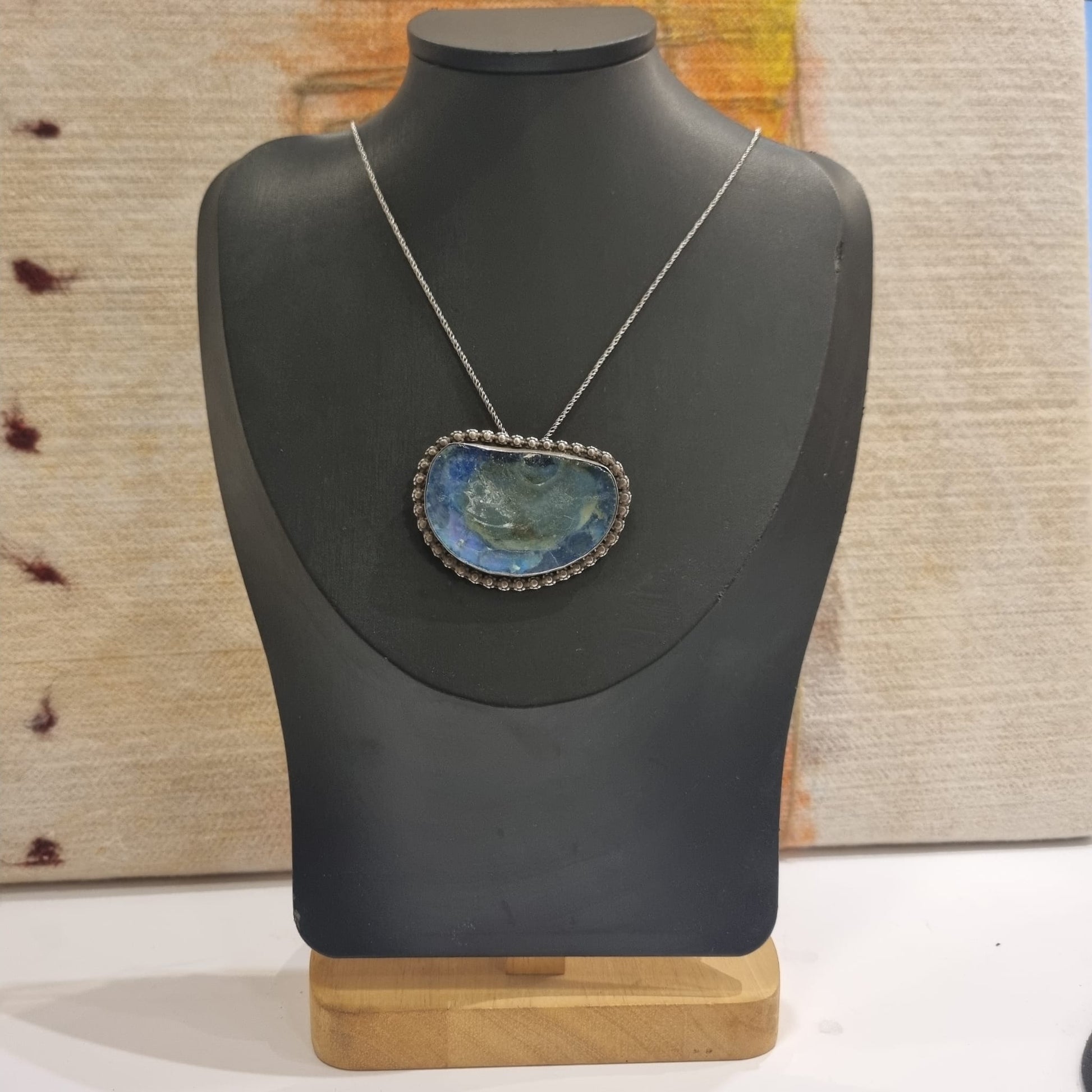זכוכית רומית עתיקה משובצת במסגרת כסף סטרלינג מעוטרת בפרטים עדינים של חרוזים. היצירה נושאת גוונים רכים של כחול וירוק, המזכירים את עומק הים התיכון. ניתן לענוד כתליון או כסיכה – יצירה מעודנת, היסטורית ובעלת זוהר שקט.