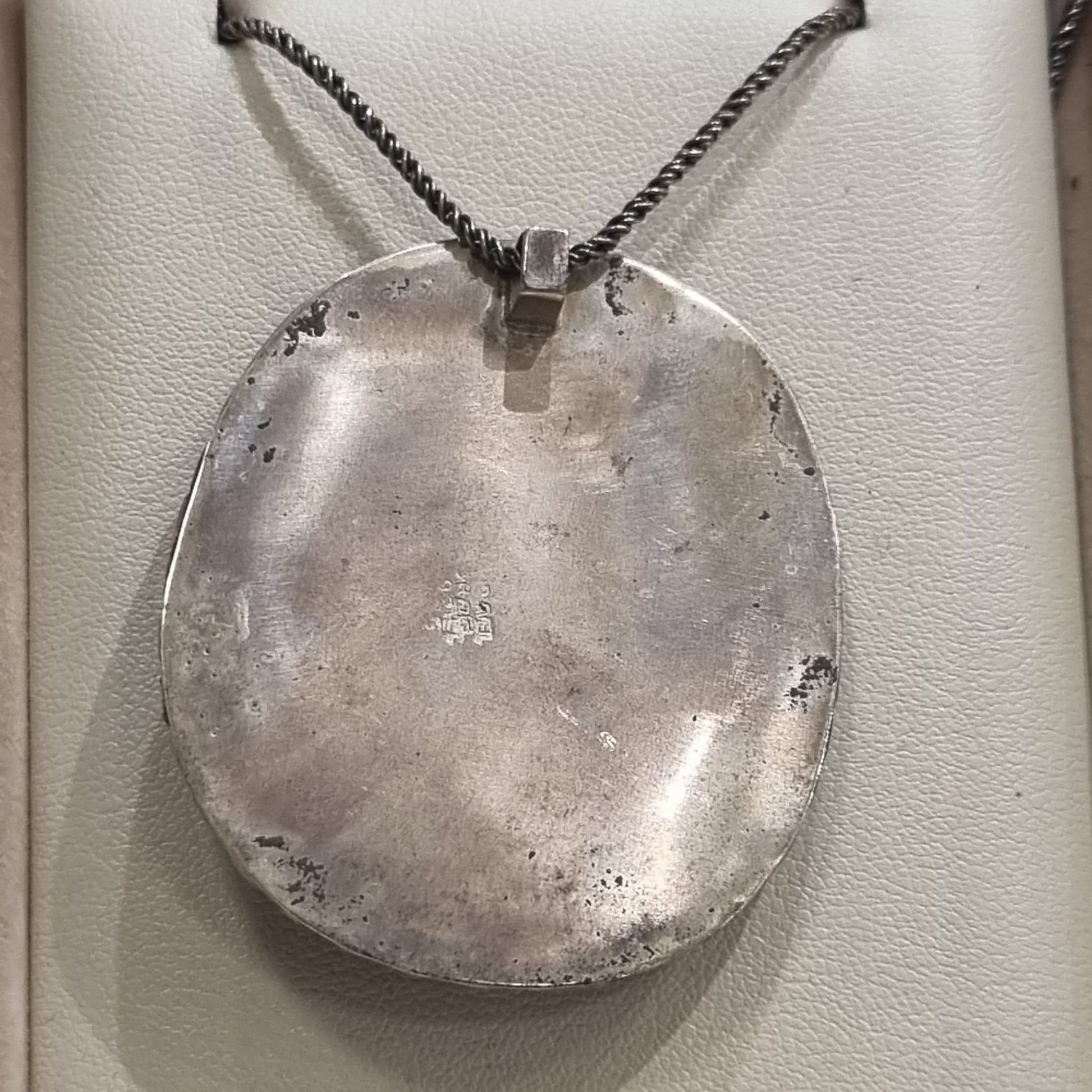 זכוכית רומית עתיקה משובצת במסגרת כסף סטרלינג בעבודת יד עם שוליים קלועים בעדינות. גווני הכחול והירוק משתלבים ברכות וחושפים מרקם קריסטלי עדין הזוהר באור עתיק. יצירה יחידה במינה שבה האלגנטיות פוגשת את ההיסטוריה.